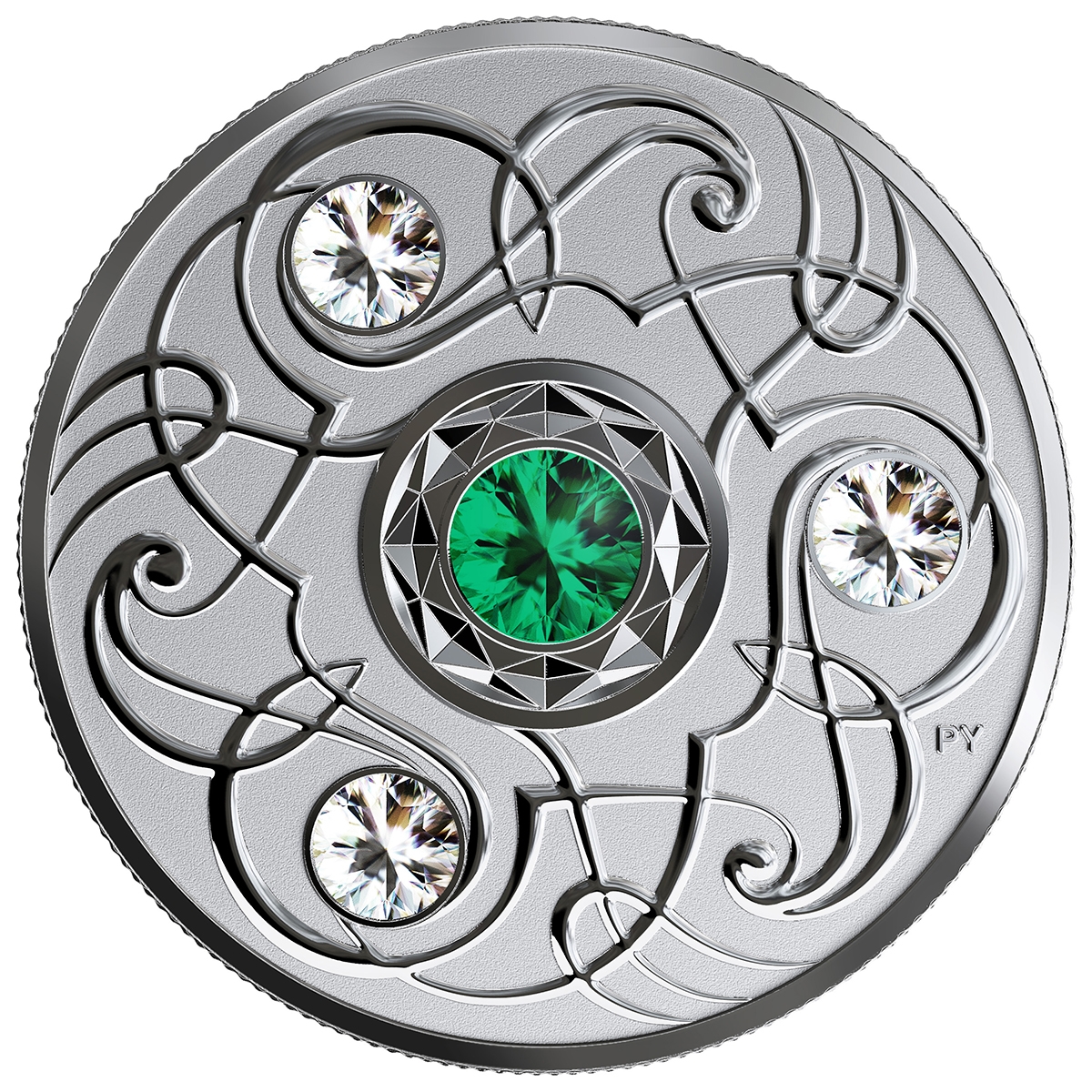 The reverse of the coin designed by artist Pandora Young features the pattern Inspired by the Celtic triskele and arranged according to the base-six system. There will be 4 Crystals on each coin. three small clear ones within the engraved pattern, and a larger one- the actual birthstone. The May 2020 coin having “Emerald” as the Birthstone. The obverse of the coin features the effigy of Her Majesty Queen Elizabeth II by Susanna Blunt.