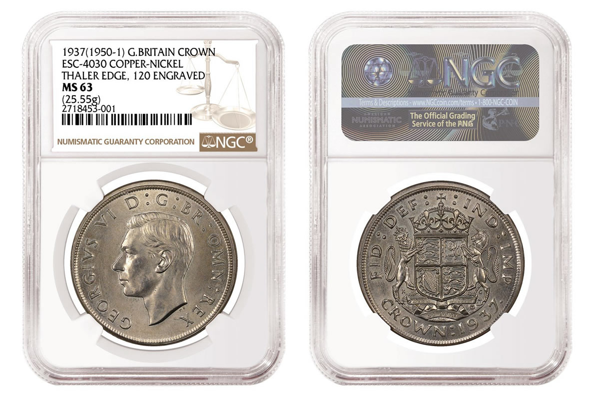 These trial coins were first reported by Stephen Hill in the Numismatic Circular in October 1998. They were probably saved from destruction by some Mint worker and today they reveal a lot about how the Royal Mint functioned in the 20th century. Two of the 1950 Crown Patterns, however, are now known to exist in private collections, and one was recently submitted to NGC for authentication and grading.The 1950 Crown patterns were struck before the 1951 Festival of Britain dies were completed. The Royal Mint, therefore, used leftover 1937 Crown obverse and reverse dies as well as an edge lettering collar that had been used to strike Maria Theresa Thaler restrikes in the 1940s. This odd pairing was likely one of convenience; the Royal Mint simply needed a collar that fit the diameter of the crown dies.